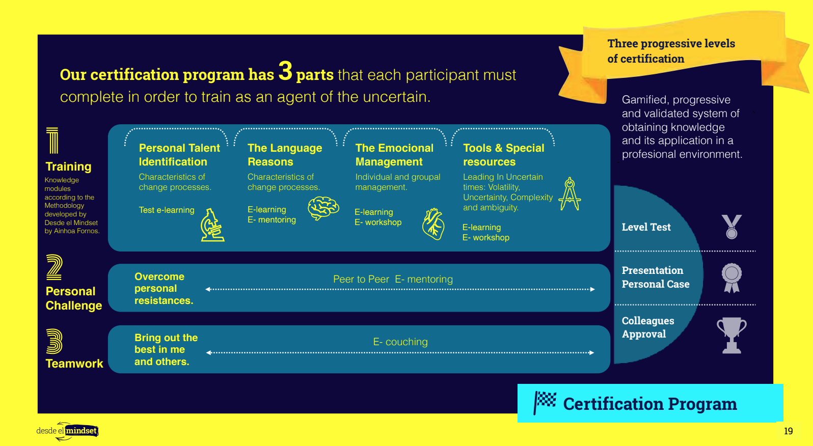 Es una convencida de que el siglo XXI va de fluir en entornos de incertidumbre y por ello es esencial Desaprender y llevar a cabo un ChangeMindset. Desde hace años se dedica a investigar sobre la capacidad del ser humano para cambiar, primero desde MIND THE GAP, luego desde NEW MINDSET FOR NEW WAVE y ahora es socia y responsable del Departamento Técnico y de Innovación de DESDE EL MINDSET.